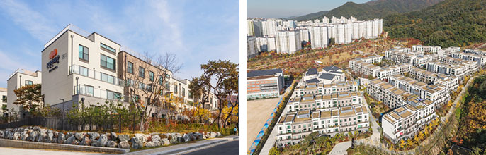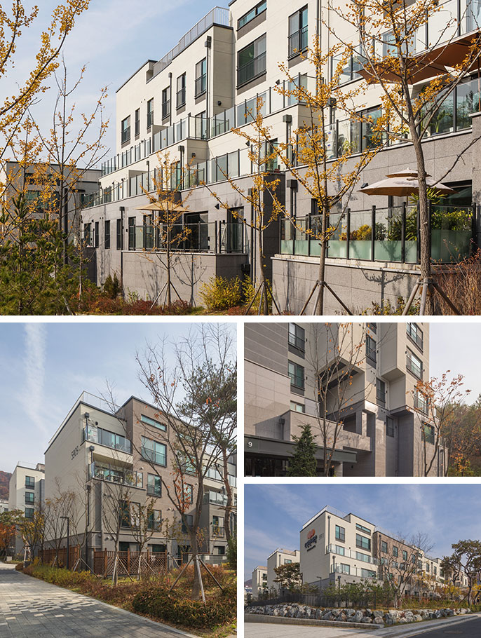 같은 세대수에 비해 여유로운 외부공간이 확보되었고,파노파마 조망을 즐길 수 있는 코너세대가 만들어졌다. 자연을 담은 5개의 중정과 도시적인 3개의 가든 사이의 가로형성과 랜드마크적 요소의 도입으로 새로운 주거형태를 제안한다.
