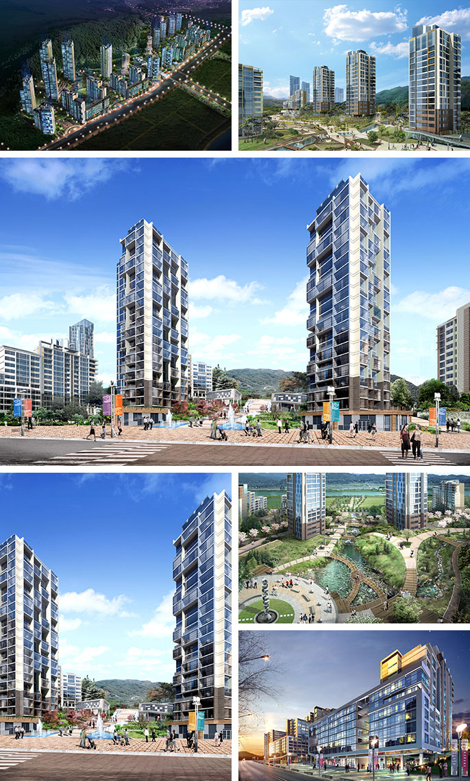 주변 산수(山水)로 열린 조망이 가능한 통경 축을 구축하여 “도시, 자연을 담다”라는 주제의 주거환경을 조성했다. 단지 내외부의 가로와 연계한 커뮤니티 공간 및 부대시설 계획, 그리고 클러스터링 기법은 자연을 품는 동시에 자연으로 열리는 새로운 형태의 주거공간을 제안한다. 테라스하우스와 커뮤니티 시설을 연계하여 경사지를 극복시킨 오픈 스페이스와 클러스터 코트를 형성하는 한편, 영역별 특성에 부합하는 주동을 계획하고 입면 및 단위세대를 특화하여 다양한 삶의 방식을 아우를 수 있는 단지를 계획한 것이 특징이다.
