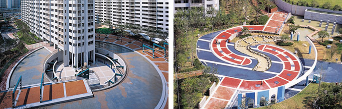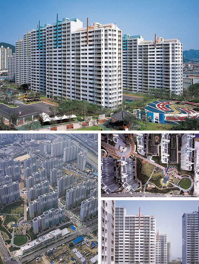 층수를 변화시켜 파도가 넘실대는 스카이라인을 구성하고 주거단지내의 오픈스페이스 및 외부공간은 상징적이며 환경친화적인 전통적 공간이 되도록 계획하였다.