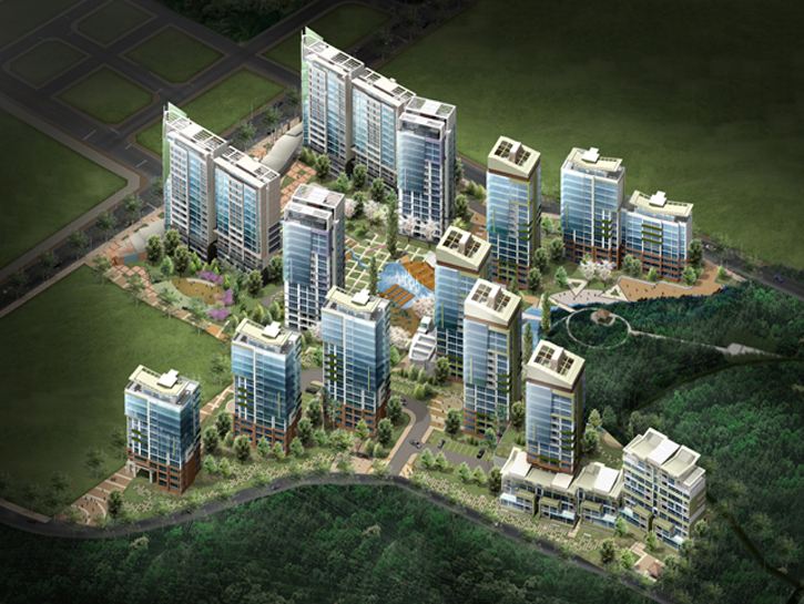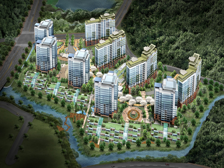 주변의 양호한 자연환경을 단지 내로 유입하는 것을 목표 삼아 데크 주차시스템을 도입하여 보행자 우선 환경을 배려했고, 경치를 조망할 수 있는 테라스하우스와 펜트하우스를 도입하여 친환경 단지를 구현했다. 또한 학교 등 중심상가를 연결 짓는 주생활 가로와의 연계를 고려하여 배치를 계획했다.