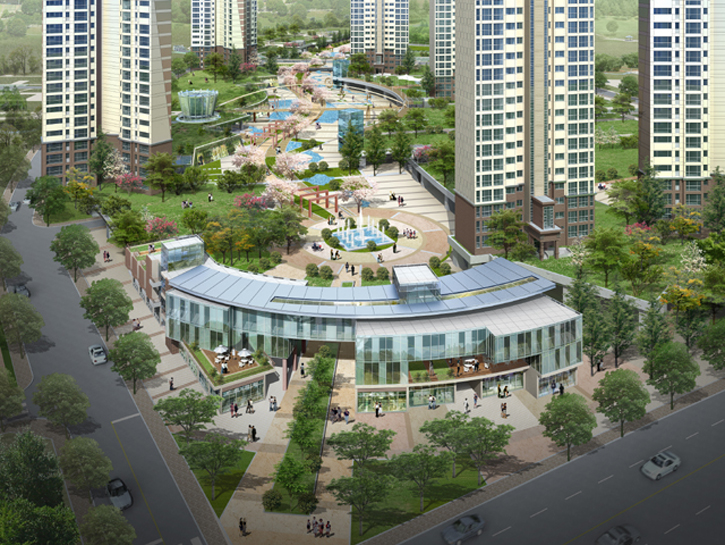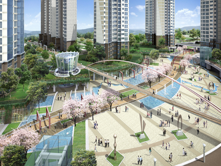 ‘자연에 의해 창조된 주거단지’라는 테마로바람의 흐름이 만들어낸 판상형의 주동,푸른 숲의 조망이 만들어낸 랜드마크 타워동,땅의 흐름이 만들어낸 테라스하우스가 조화를 이루는생태주거단지로 계획하였습니다.