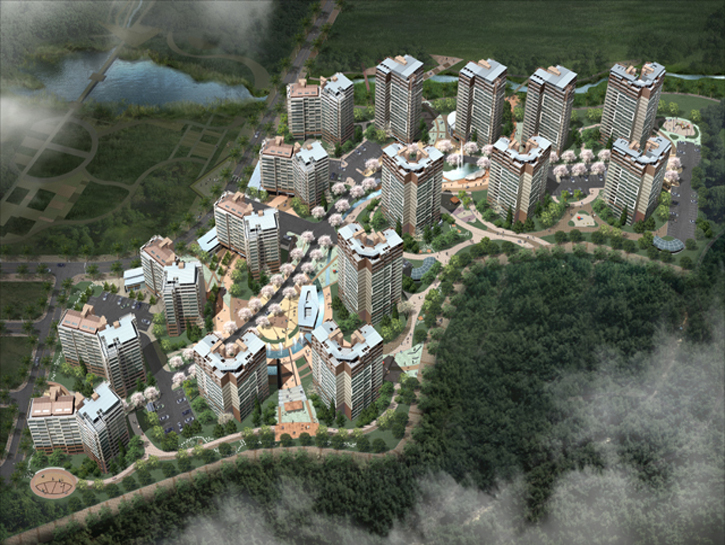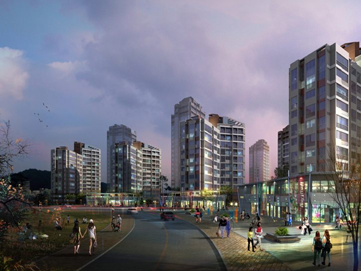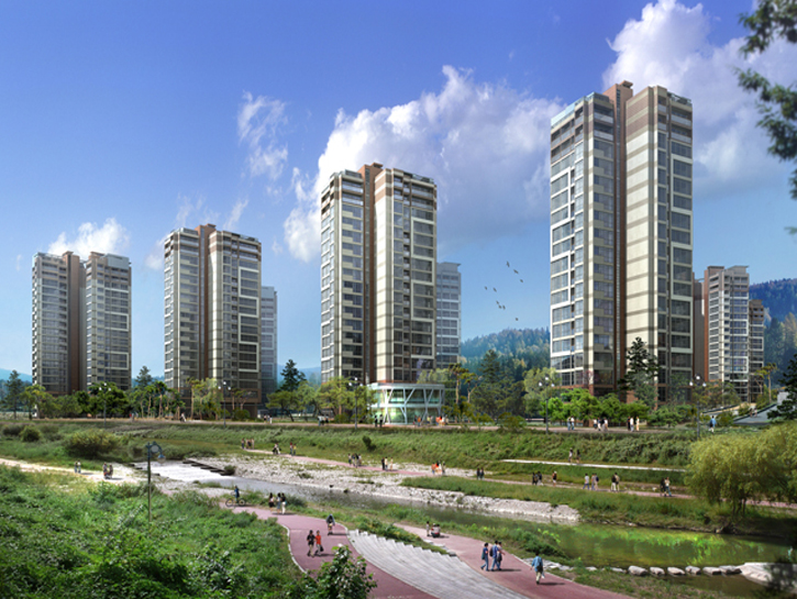 남서쪽의 칠보산과 연결되는 산림, 그리고 대지를 가로지르는 금곡천, 호매실천 등 풍부한 자연요소를 갖춘 주변 환경을 반영하여 자연과 어우러진 건강생태단지를 테마로 했습니다. 전체 배치계획에서는 수변 공원 및 인접 주거지로 열린 주동을 배치하고 금곡천의 수공간을 활용한 천수 단지를 구성하는 한편(Water Scape), 외부 공간은 칠보산의 광역 녹지를 적극적으로 유입하여 자연과 공생하는 오픈 스페이스(Green Square)를 형성했습니다. 또한 건축계획에 있어 기존 주거지와의 소통 연계를 고려한 주동 계획 및 수변과 고속도로변을 고려한 랜드마크 주동계획(Urban Square)으로 다채로운 경관을 연출한 것이 특징입니다.