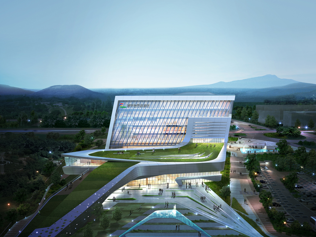 제주혁신도시 ‘삼다시티’에 위치한 공무원연금공단 신사옥은 공단의 비상하는 새와 제주의 자연이 함께하는 「솟아오름」,「감아오름」,「어우름」의 3가지 흐름을 개념으로 계획했다.