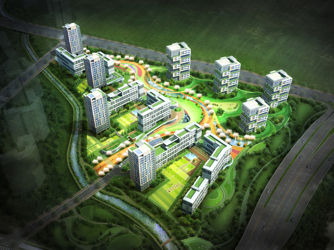 광교지구 관문에 위치한 사색마당이 있는 숲속의 정온마을 만들기용적률100%의 사업부지는 전통적 길과 마을의 요소를 도입한 사색마을로 중저밀 랜드마크단지를 구현하였으며, 광교산과 여천의 자연요소를 유입한 환경친화 및 커뮤니티 네트워크와 연계한 소통하는 힐링 커뮤니티 가로를 담은 마을을 구현하였습니다.