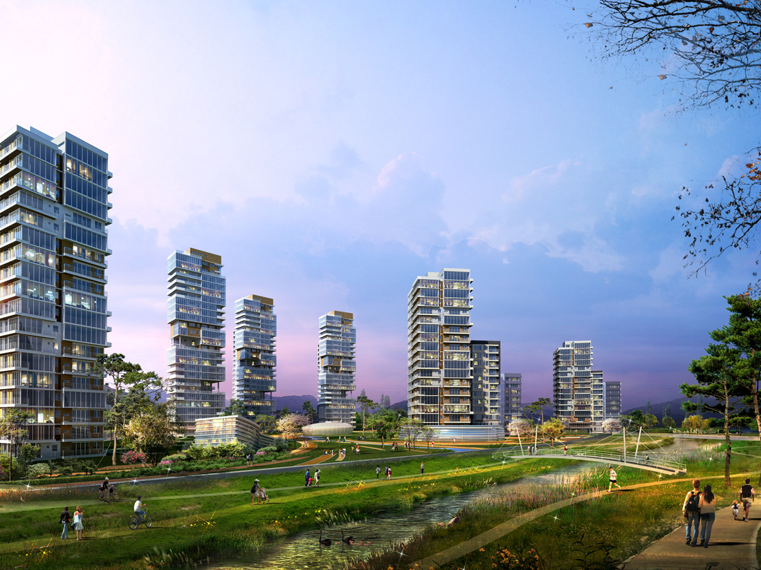 단지계획에서는, 성내천을 중심으로 두 블록이 함께 하는 넓은 외부공간을 조성해 특징 있는 천변 경관을 조성하고, 조닝계획에서도 남측 저층주거지 및 성내천을 고려한 계단형 주동과 북측 대로변에 타워형 주동을 각각 배치해 리드미컬한 도시 경관을 제공했으며, 부대시설 계획에서도, 1,2블럭을 연결하는 보행로와 천변 주위에 시설을 배치해 친환경 커뮤니티 공간을 제공하고, 남측 주택지변에 휴게소 등의 외부공간을 계획해 지역민과의 커뮤니티를 극대화해 천변을 중심으로 한 서울 시민의 쾌적한 주거공간을 현실화 했습니다.