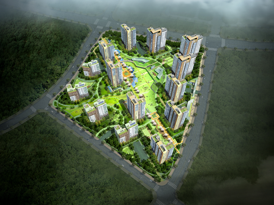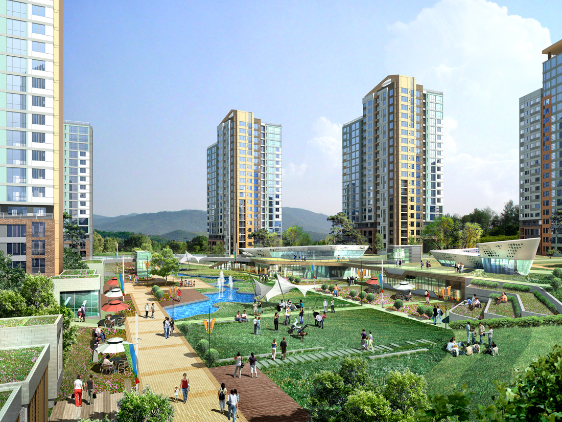 공원, 상업시설, 학교에 대응하는 3가지 테마의 외부공간영역 설정하고, 북측 복합문화가로와 메인녹지축, 상업시설에서 남동측의 학교까지 이어지는 ‘밴드형 커뮤니티’를 통해 다양한 예술놀이와 거리와의 만남을 구현했습니다. 또한 자연과 도시가 어우러지는 문화축과 문화클러스터로 특색있는 외부공간을 형성하고, 라이프스타일을 담은 ‘스마트 주거공간’과 함께 쾌적한 환경조성 및 에너지 절감형 단지를 계획했습니다.