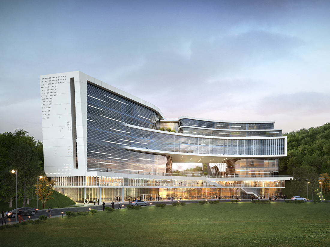 업무환경을 고려하여 남향배치를 극대화하고, 경사지형에 순응하는 전면부 다단식 배치 및 제2테크노밸리와 자연을 잇는 커뮤니티 밸리를 계획하여 입체적인 경관을 연출하였다.
