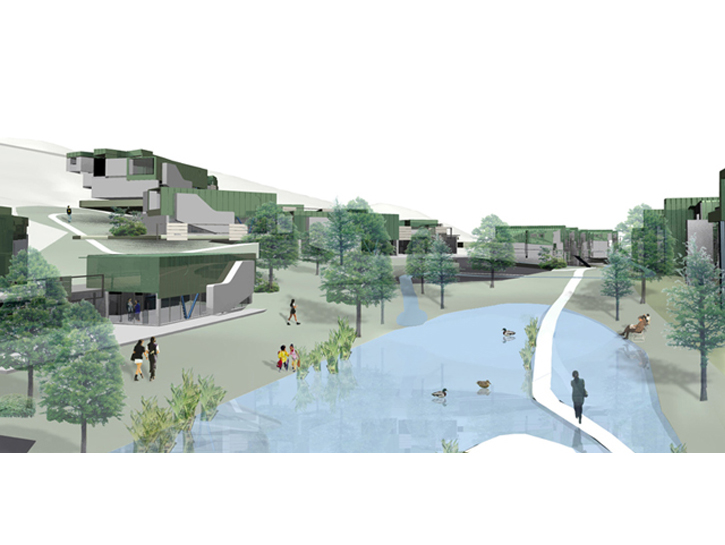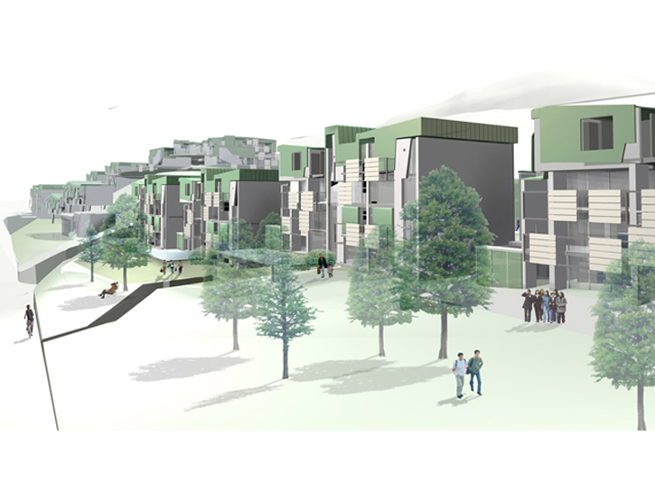 대지의 지형/환경적 특성의 반영을 가장 중요한 계획 요소로 설정하여, 주변의 자연환경적 요소를단지 내에 끌어들이고자 한 프로젝트입니다. 또한 경사지형 및 장소성에 따른 영역별 거주형을 설정하여 배치하고, 이렇게 다양한 주거 유형을 통해 연립단지만의 아이덴티티를 구축했습니다. 주거유형은 다양한 매스의 공간적 조합을 이룬 ‘연동식 연립주거]와 경사지형에 부합하는 ‘계단식 테라스형], 층수가 낮고 긴 형태의 ‘선형주동] 등으로 구성했습니다.