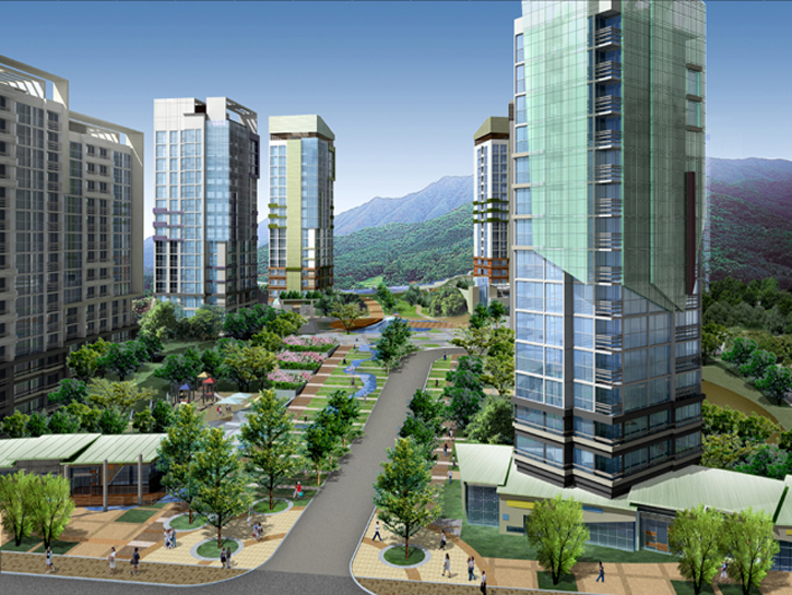 주변의 양호한 자연환경을 단지 내로 유입하는 것을 목표 삼아 데크 주차시스템을 도입하여 보행자 우선 환경을 배려했고, 경치를 조망할 수 있는 테라스하우스와 펜트하우스를 도입하여 친환경 단지를 구현했다. 또한 학교 등 중심상가를 연결 짓는 주생활 가로와의 연계를 고려하여 배치를 계획했다.