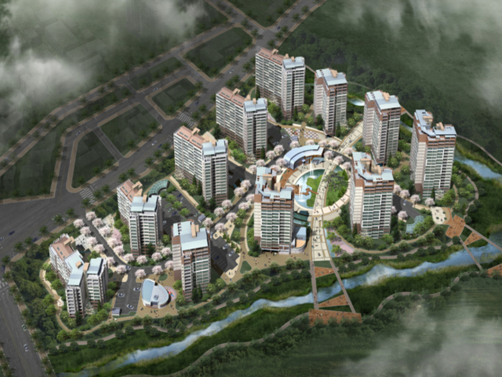 남서쪽의 칠보산과 연결되는 산림, 그리고 대지를 가로지르는 금곡천, 호매실천 등 풍부한 자연요소를 갖춘 주변 환경을 반영하여 자연과 어우러진 건강생태단지를 테마로 했습니다. 전체 배치계획에서는 수변 공원 및 인접 주거지로 열린 주동을 배치하고 금곡천의 수공간을 활용한 천수 단지를 구성하는 한편(Water Scape), 외부 공간은 칠보산의 광역 녹지를 적극적으로 유입하여 자연과 공생하는 오픈 스페이스(Green Square)를 형성했습니다. 또한 건축계획에 있어 기존 주거지와의 소통 연계를 고려한 주동 계획 및 수변과 고속도로변을 고려한 랜드마크 주동계획(Urban Square)으로 다채로운 경관을 연출한 것이 특징입니다.