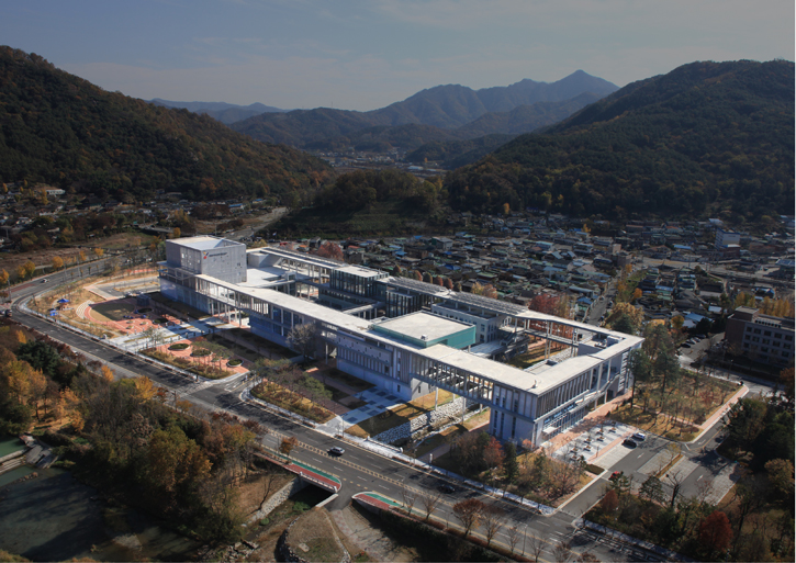 무형 문화유산의 가치를 건축과 공간으로 유형화해야 한다는 과제를, ‘생성의 장으로서의 무형의 틀’이라는 개념으로 구현시킨 당선작입니다. 전통과 현대, 열림과 닫힘의 경계를 기능과 역할에 따라 잘 조화시켰다는 심사평을 받았습니다. ‘보존의 틀’이라 할 수 있는 전체 건축물은 주변 숲이 지녔던 기억과 틀 안에서 만들어질 내일의 기억을 함께 보존하는 장으로서 계획했습니다. 이 틀의 내부에서 크게는 하나로 통합되면서도 전시, 공연, 전통공원 등 체험 프로그램에 의해 구분될 수 있는 조각보 마당이 펼쳐집니다. 또한 복도와 데크로 이루어진 회랑 네크워크는 궁궐 회랑처럼 이들 마당과 전당의 9개 센터를 연결합니다. 이처럼 가르침과 배움, 놀이와 구경, 전시와 연구 등 다양한 상호작용이 회랑과 마당, 마루를 넘나듦으로써, 생명력 있는 전승의 장소가 만들어지도록 했습니다.