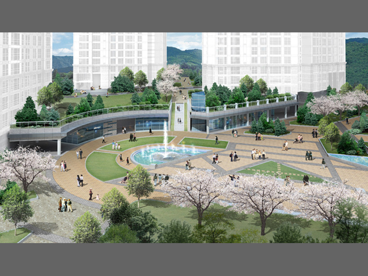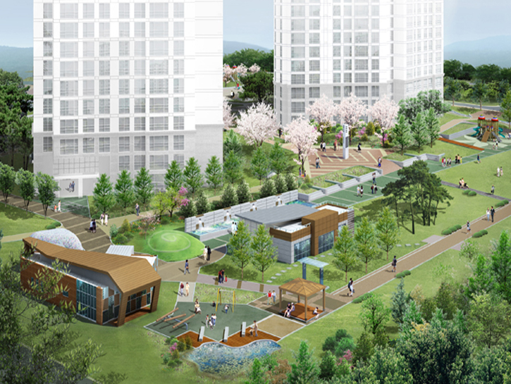 자연을 닮은 주거단지로서 친환경인증 최우수등급계획을 수립한 당선작입니다. 인근 광교산을 고려한 통경축과 바람길을 고려하고 공공조경에 테마를 부여하여 적극적인 외부 공간 및 단지 배치계획을 세웠습니다. 지형을 고려한 데크 시스템을 도입하여 차 없는 지상 환경을 조성하는 한편, 보육시설 접근을 고려한 별도의 차량동선을 마련했으며, 주변 컨텍스트에 맞춰 자연경관대응형, 초고속경관형, 도시가로 대응형 주동이 펼쳐지는 가운데, 진입광장부터 프리즘광장(중앙광장)과 연계되어 이어지는 생활가로를 따라 입체적 구성의 커뮤니티가 형성되고 운영될 수 있도록 했습니다.
