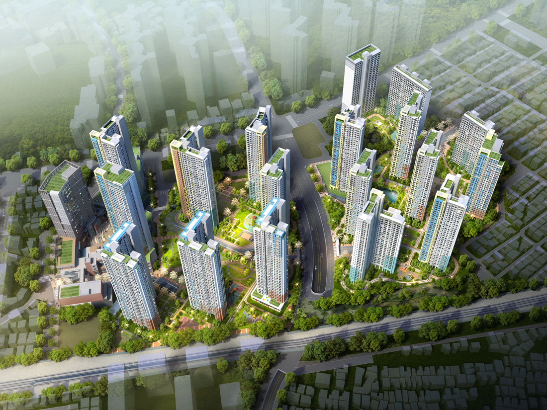 더불어 외대앞역을 중심으로 준교육시설, 스트리트몰, 휘트니스센터, 이벤트광장 등을 도입하여, 주민의 여가_주민자치 공간을 조성하고 삶의 질을 향상시켜 주거와 문화기능이 복합된 미래지향적인 주거단지를 조성토록 계획 하였습니다. 구릉지인 3-2구역은 주변의 양호한 도시경관 보호와 쾌적한 주거단지 조성을 위해 90%에서 75%로 하향시켜 지상 4층의 공동주택 7개동에 총152세대가 건립되며, 도심 속의 복잡함을 벗어나 천장산의 흐름을 잇는 주동배치와 지형단차를 이용한 테라스하우스 등의 계획으로 고급스럽고 자연 친화적 타운하우스 단지로 조성 되었습니다.