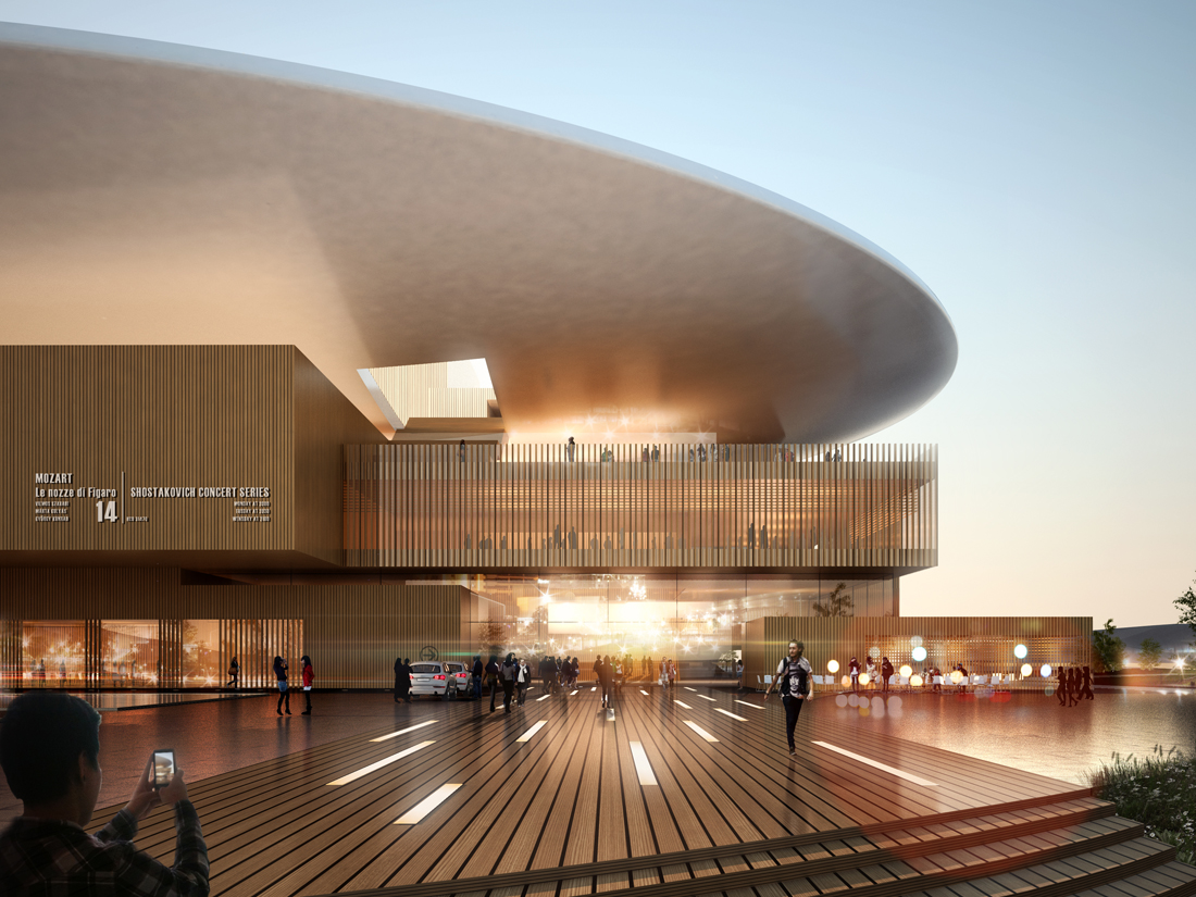 이 곳은 더 이상 단순한 오페라하우스가 아닌, 사람과 자연과 예술이 서로 섞여 만드는 축제 와 사교의 장이 되는 것이다. 원형 지붕이 만들어내는 오목한 공간은 야외극장이다. 바람과 햇빛과 비를 모두 맞으며 예술적 흥분을 경험할 수 있다. 원형지붕의 아래에서는 서로 다른 기능들이 어우러진 도시적 풍경이 펼쳐진 다. 음악은 그 사이를 흐르게 된다. 모두가 향유하는 예술로 승화될 것이다.