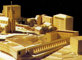 대성당을 향하여 상승하는 현재 지형의 이용과 건물군의 형상과 재료에서 보이는 고딕적 공간구조의 전반적인 연출을 계획의 주안점으로 삼았다. 초기 기독교 건축이 가졌던 영역의 위계를 되살리고자 명동 거리에서 들어온 하단 광장, 신에게 나아가는 계단, 그리고 성스러운 광장, 신의 상징인 교회 등이 나타내는 수직적 회랑형 구조물을 설치하여 사회공간과 종교공간을 융화시키고 있다.