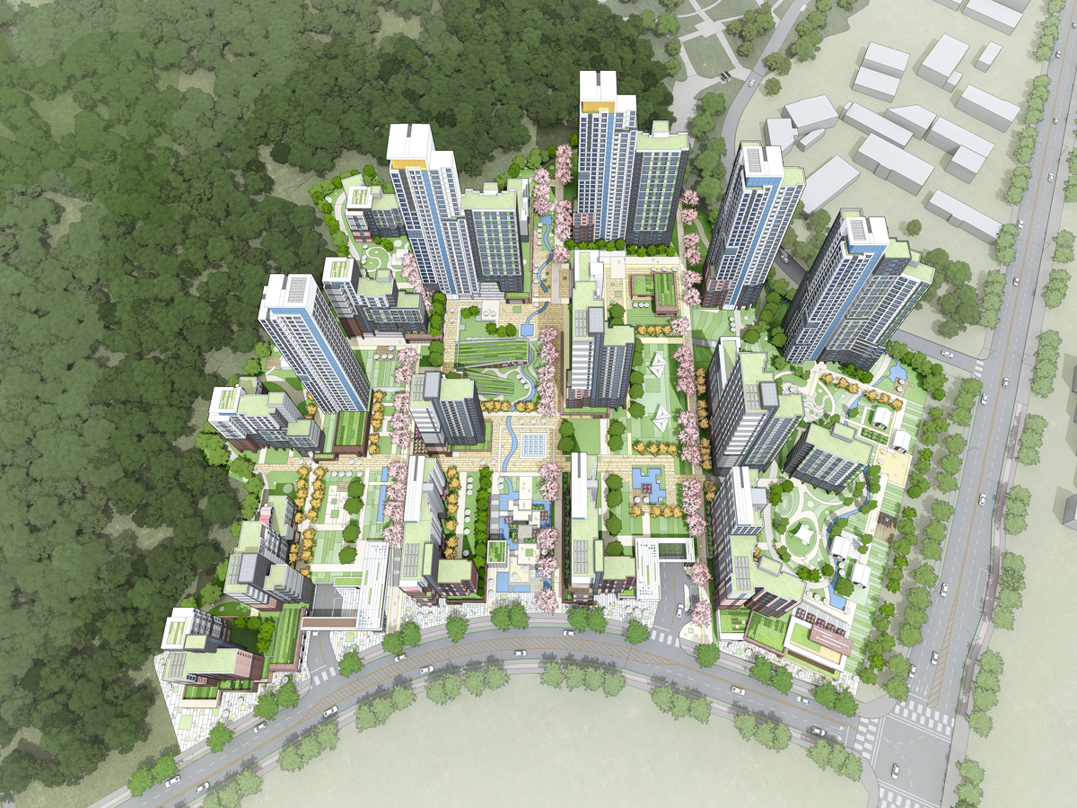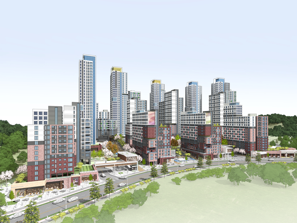 주동의 형태는 생활 가로변의 분절된 스케일, 가든 스텝형, 버티컬 그린주동으로 구성되며, 필로티 특화 계획을 통해 주동 하부의 노출된 피트를 활용한 디자인을 제안했습니다. 일부 세대에는 복층형 및 테라스형을 적용해 외부 공간을 포함하도록 했습니다. 또한, 저층-중층-고층의 중첩된 경관을 통해 조화로운 주구 경관을 계획하였고, 생활 가로변에 상가, 도서관, 쉼터 등의 지역 공유 시설을 배치해 지역과 소통을 강화했습니다. 단지 중심에는 어린이집과 입주민 힐링 시설을 배치하여 우리 아이들의 안전과 입주민의 편의를 고려했습니다.